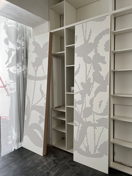From hereon the adventure begins. The cherry jewel beetle usually lives in dead branches in orchards. However, in the Petshop by karhard®, in Berlin-Kreuzberg, the beetle is emblazoned as a massive carpet on the wall, custom-made by the carpet manufacturer Ferreira de Sá from Portugal (established 1946). The blue-black colours on the beetle's magnificent shell are brought to life with the composition of botanical silk, mohair and wool, making it belong to the unique species of “cuddly carpet beetles”. Anyone who sees him immediately wants to get up close and personal with him, and that's precisely what the shop owners want: to get personal and connected.